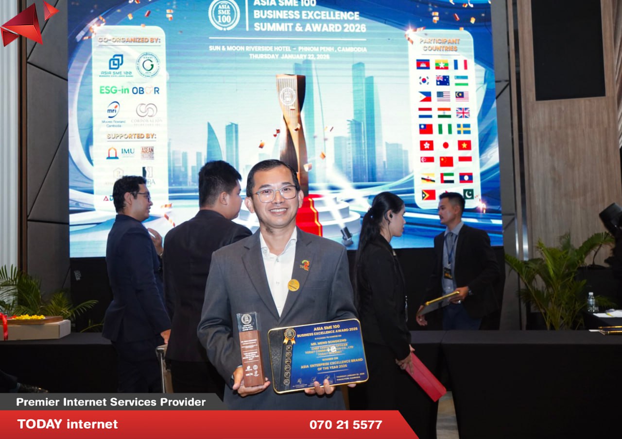 នាយកប្រតិបត្តិនៃក្រុមហ៊ុន TODAY internet បានទទួលពានរង្វាន់ឆ្នើម ASIA SME 100 BUSINESS EXCELLENCE SUMMIT & AWARD 2026 នៅសណ្ឋាគារ SUN & MOON RIVERSIDES